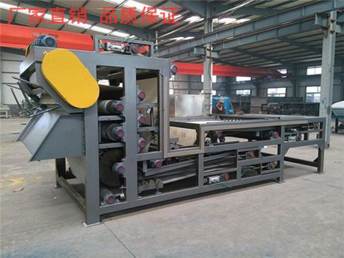 沙场泥浆带式压滤机是通过两条滤带缠绕在一系列顺序排列、大小不等的辊轮上,利用滤带间的挤压和剪切作用,来脱除料浆中水分的一种压滤设备,具有着能连续作业、自动化程度高、节能、使用维护方便等优点,是一种进行污泥脱水减量化处理的理想设备。