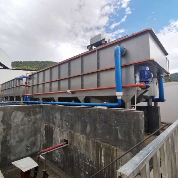 气浮机的好氧系统处理后流出的水,溢流到沉淀池中,沉淀后清水流到消毒池,沉淀池中的污泥定期用泥浆泵打入污泥浓缩罐中。